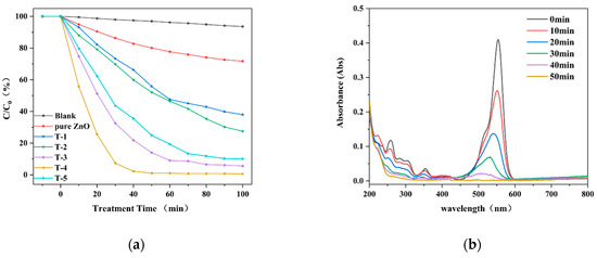 To study the effect of treatment time on the activity of semiconductor catalysts, ZnO (T-1, T-2, T-3, T-4 and T-5) was used for photocatalytic degradation of Rh B solution. The experimentally measured change curve of C/C0 of Rh B solution with catalytic time is shown in Figure 7a. The blank experiment is the Rh B solution, which is directly illuminated by a 50 W light source with no catalyst. It is worth noting that ultraviolet light illumination in the absence of any photocatalyst or dark conditions with catalysts do not lead to the degradation of Rh B. In fact, in the blank experiment, only 6.3% of the Rh B solution was degraded under the UV light source within 100 min (6.3%). In the degradation experiment after addition of pure ZnO, the degradation rate of Rh B was improved but still showed poor degradation capacity. The Ar–H plasma-modified ZnO significantly enhanced the degradation of Rh B, and the degradation rate first increased and then decreased with time. The degradation efficiency was the highest when the plasma treatment is 120 min, and the Rh B solution was degraded by 97.8% within 40 min.