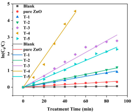 Fitting the reaction kinetics of the results of each group of photocatalytic degradation experiments, the results are shown in Figure 8. The degradation rate of Rh B solution decreased significantly after 90% degradation, therefore, for this experiment, a fitting analysis was performed up to a 90% degree of degradation. It can be seen from the Figure 8 that the reaction rate constant k in the blank experiment was only 0.00065 min−1. After the catalyst was added, the degradation rate of Rh B was significantly increased, in which the reaction rate constant was 0.08933 min−1 when the treatment time was 120 min. The fitting data of the experimental results are shown in Table 1. In all the results, R2 is greater than 0.99, indicating that ln(C0/C) in the Rh B degradation experiment results shows a linear relationship with time t, which is a first-order reaction and meet the above equation. It can be seen that the sample with the best photocatalytic degradation effect on Rh B solution is T-4.