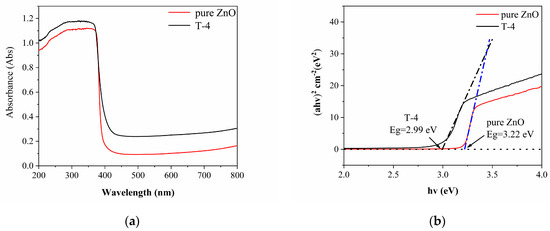 To further study the mechanism of improving photocatalysis and the mechanism of plasma modification, more characterization methods were used. The ultraviolet–visible diffuse reflectance spectroscopy (DRS) was used to characterize the degree of electron–hole pairs generated by the samples and the band gap width. As shown in Figure 9a, the ultraviolet–visible (UV) absorption edge wavelength was observed at the wavelength of 375 nm, which is the inherent absorption band gap of ZnO (3.2 eV) [42]. The plasma modification process did not affect the change of the main absorption band of ZnO, the main absorption band of ZnO is shorter than 400 nm, and the absorption band of the T-4 sample was very similar to that of pure ZnO. T-4 sample also reveals other absorption peaks, which is due to plasma treatment in the visible light region (400–700 nm). T-4 nanomaterial exhibits an absorption ability also in the visible range.