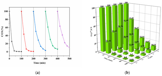 Figure 10. (a) Cyclic degradation curve and (b) three-dimensional curve of Rh B.