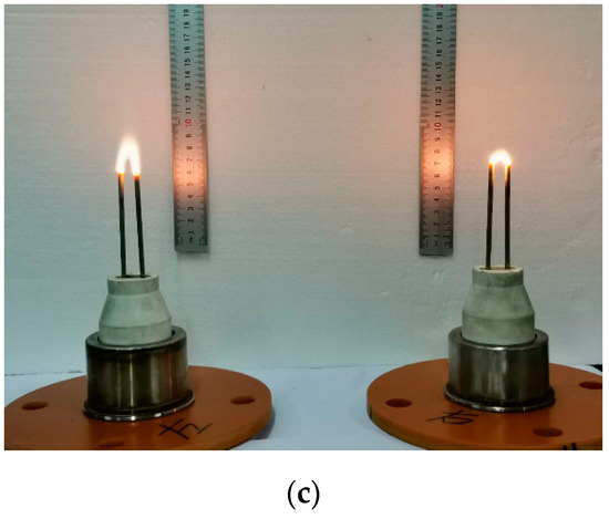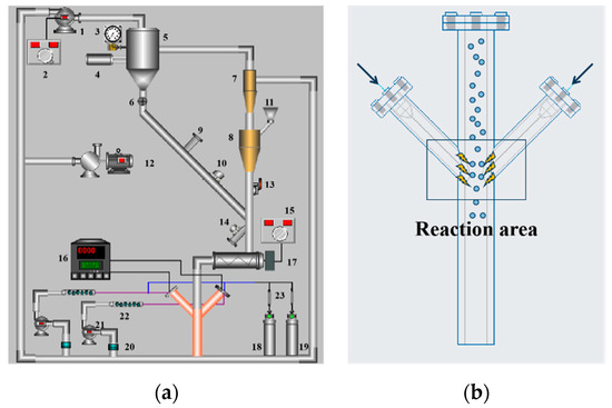 Figure 12a shows plasma fluidized bed equipment used in the experiments, which is made up of stainless steel. It mainly consists of two compartments: (i) The plasma generator is composed of a pair of ceramic discharge nozzles (length 150 mm and inner diameter 40 mm) and two pairs of parallel electrodes (length 120 mm and bottom diameter 20 mm) and (ii) The separation and collection units include cyclone separation, bag filter and induced draft fan. The fan helps the carrier gas to circulate the ZnO in the plasma reactor. The products are mainly collected by a cyclone separator, and the rest is collected after being separated from the exhaust gas through a cloth bag. The details on the facility are referred to Figure 12a and Table 2 [52].
