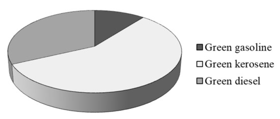 Following the hydrocracking reaction of fatty acid in HPOME, a crude bio-fuel yield of 96 ± 0.04% was obtained. Based on the volume fraction, crude biofuel could be classified into three kinds: green kerosene (54 ± 0.03%), green diesel (30 ± 0.04%) and green gasoline (10 ± 0.04%), respectively. In addition, their selectivity was also reached at 57.44 ± 0.06%, 31.91 ± 0.03% and 10.64 ± 0.05%, as illustrated in Figure 2.