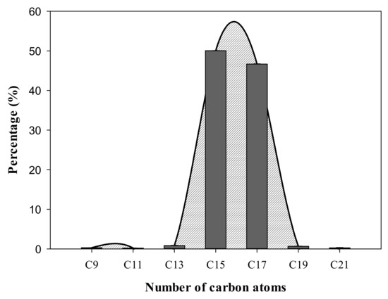 The characteristic of refined biofuels in terms of the carbon number was analysed by Gas chromatography- Mass spectroscopy (GC–MS). According to the result in Figure 3, the carbon atom distribution of refined biofuels was mainly in the ranges of kerosene (C9–C15) and diesel (C15–C18). This was due to three major fatty acid compositions of HPOME: palmitic acid (C16:0), stearic acid (C18:0) and oleic acid (C18:1). One carbon atom of the carboxyl group (–COOH) was eliminated during decarboxylation [22]. It should be noted that the refined biofuels were produced and measured in triplicate for reproducibility.