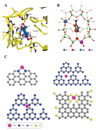 (A): Stereoview of the active site of glucose oxidase with the modelled substrate β-d-glucose [4]. Reproduced with permission of the International Union of Crystallography. (B): The structure of γ-valerolactone within zeolite pores as obtained using in situ X-ray diffraction data [5]. Reprinted with permission from [5]. Copyright 2020, Nature Springer. (C): Single Pt atoms bounded to N- rich or S- rich regions in doped carbonaceous supports [10]. Reprinted with permission from [10]. Copyright 2018, Nature Springer.