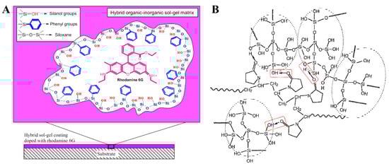 (A): Schematic representation of the porous structure of a phenyl modified silica matrix doped with Rhodamine 6G molecules [13]. Reprinted with permission from [13]. Copyright 2015, Nature Springer. (B): Structure of PVP-silica hybrid material [15]. Reprinted with permission from [15]. Copyright 1992, Nature Springer.