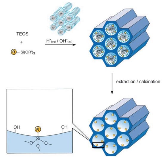 Co-condensation between tetraethyl ortosilicate (TEOS) and a generic silyl-derivative compound, RSi(OR’)3, followed by calcination/extraction to achieve hybrid organic-inorganic mesoporous silica [22]. Reprinted with permission from [22]. Copyright 2006, John Wiley and Sons.