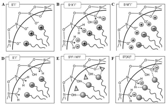 Typically, a lyotropic liquid-crystalline phase is formed above a certain concentration of surfactant. However, a cooperative self-assembly between the SDA and the silica precursors can lead to a liquid-crystal phase with hexagonal, cubic, or laminar arrangement, even at lower concentration of surfactant. An essential condition to ensure this cooperative self-assembly and avoid phase separation is the presence of attractive interactions between the template and the silica precursor. Such interactions vary, depending on the type of surfactant and on the pH of the solution. If the reaction takes place under basic conditions, silica species will be present in the form of anions. If a cationic quaternary ammonium surfactant is used as the SDA, electrostatic interactions such as those depicted in Figure 11A will be produced. However, if the preparation takes place below pH 2, silica species will be positively charged and to produce an interaction with the cationic surfactant, it is necessary to add a counter ion X− (usually a halide, Figure 11B). Although less commonly, negatively charged surfactants (e.g., long-chain alkyl phosphates) can also be used as the SDA. Compared to positively charged surfactant, a reverse situation is expected, with protonated silicon species interacting with the negatively charged functional groups of the surfactant molecules, at pH below 2 (Figure 11C), and a mediating positive ion M+ needed under basic conditions (Figure 11D). Lastly, when non-ionic surfactants are used (e.g., long chain amines), attractive interaction between SDA molecules and silica precursors are provided by hydrogen bonds. Such interactions can be promoted by adding to the mixture either polar molecules (e.g., polyethylene oxide, depicted as triangles in Figure 11E) or ion pairs (Figure 11F) [22].