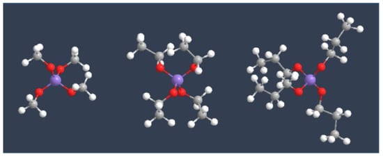 Ball and stick representation of tetramethyl ortosilicate (TMOS), tetraethyl orthosilicate (TEOS) and tetrapropyl orthosilicate (TPOS).