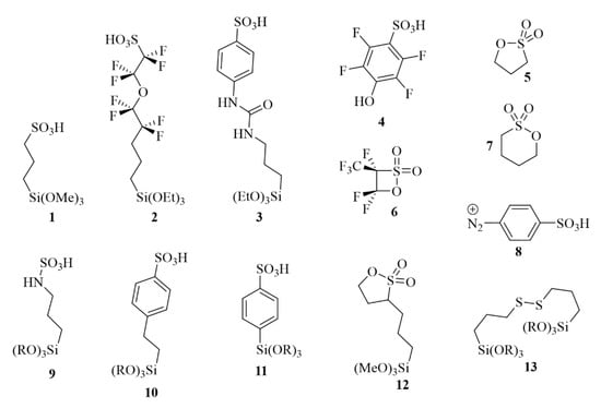 Several substrates featuring sulfonic acid groups have been implemented as precursors for the sulfonation of mesoporous materials. From the point of view of the inclusion of sulfonic acid groups into the final hybrid materials, different approaches can be followed: (i) implementation of commercial sulfur-containing organosiloxanes and eventual conversion of the sulfur-based functional groups to sulfonic acid moieties, usually carried out after incorporation into the solid material (e.g., MPTMS); (ii) synthesis of new silyl-derivatives containing sulfonic acid groups; (iii) functionalization of supported organic moieties with sulfuric acid [52,63,64]. In Figure 14, some organic moieties that have been successfully used to synthesize silica-supported sulfonic acid catalysts are reported, including alkyl-sulfonic acids (precursors 1, 2), aryl-sulfonic acids (precursors 3, 4, 8, 10, 11), S-containing heterocycles (precursors 5–7 and 12) and bridged species (precursor 13). Unsurprisingly, using different siloxane precursors influences the properties of the final catalyst, across the board. A few examples are reported below.