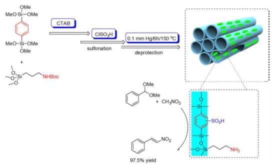 - Shylesh, S.; Wagener, A.; Seifert, A.; Ernst, S.; Thiel, W.R. Mesoporous Organosilicas with Acidic Frameworks and Basic Sites in the Pores: An Approach to Cooperative Catalytic Reactions. Angew. Chem. Int. Ed. 2010, 49, 184–187. [Google Scholar] [CrossRef] [PubMed]