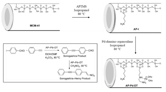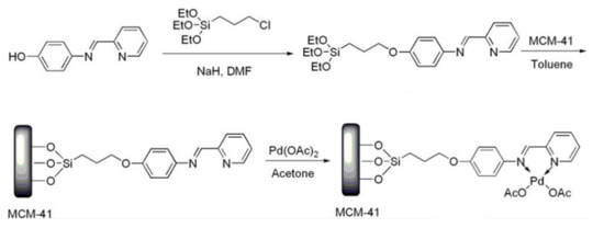 - Habeche, F.; Hachemaoui, M.; Mokhtar, A.; Chikh, K.; Benali, F.; Mekki, A.; Zaoui, F.; Cherifi, Z.; Boukoussa, B. Recent Advances on the Preparation and Catalytic Applications of Metal Complexes Supported-Mesoporous Silica MCM-41 (Review). J. Inorg. Organomet. Polym. Mater. 2020, 30, 4245–4268. [Google Scholar] [CrossRef]