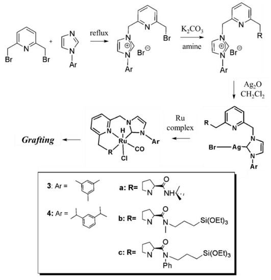 - Sommer, W.J.; Weck, M. Supported N-Heterocyclic Carbene Complexes in Catalysis. Coord. Chem. Rev. 2007, 251, 860–873. [Google Scholar] [CrossRef]