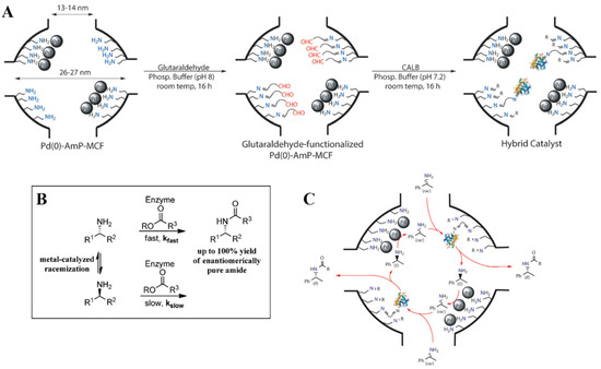 - Li, P.; Liu, H.; Yu, Y.; Cao, C.Y.; Song, W.G. One-Pot Multistep Cascade Reactions over Multifunctional Nanocomposites with Pd Nanoparticles Supported on Amine-Modified Mesoporous Silica. Chem. An Asian J. 2013, 8, 2459–2465. [Google Scholar] [CrossRef]