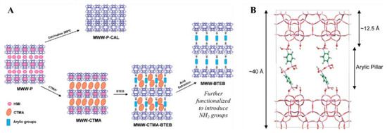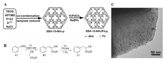 PMOs are a class of silica-based organic–inorganic hybrid materials obtained by hydrolysis and condensation reactions of bridged silsesquioxane precursors of general formula (R’O)3Si-R-Si(OR’)3, used as the only silicon source [23,24]. In contrast with the two methods previously reported (grafting and direct synthesis), in this case, the organic building blocks bear two alkoxy-silyl groups that can largely improve their incorporation in the three-dimensional network as well as their homogeneous distribution throughout the solid (Figure 7A). Moreover, a major difference between PMOs and silica-based hybrids obtained by co-condensation and grafting is that in the former, active sites are imbedded into the pore walls, rather than pending from the surface of the support. As in the case of the synthesis of pure silica mesophases, the use of a surfactant in the presence of bi-silylated organosilica precursors allows obtaining materials featuring ordered mesopores, narrow pore size distribution and in which the organic bridges are integral components of the silica network [22].