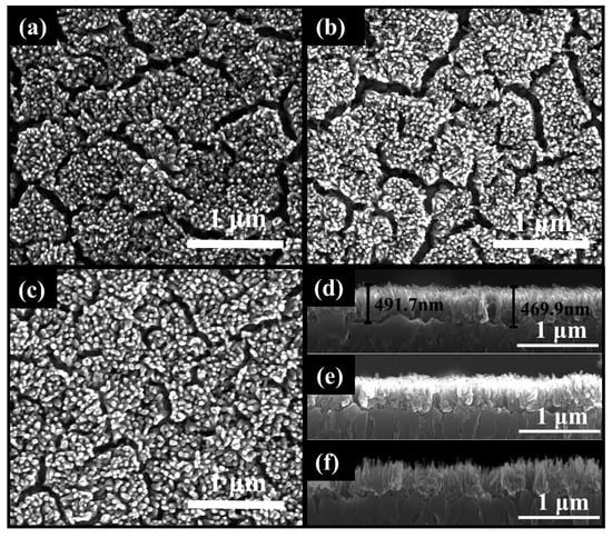 Ti-Fe2O3 nanowire photoanodes were selected to investigate the effect of O2 plasma treatment on the PEC water oxidation performance. The films were synthesized on F-doped SnO2 conductive glass (FTO) substrates via a hydrothermal method and post-treated with O2 plasma. The scanning electron microscopy (SEM) images in Figure 1 present the surface and cross-sectional images of the pristine Ti-Fe2O3 and oxygen-plasma-treated Ti-Fe2O3 (OPT-Ti-Fe2O3) photoanodes. Figure 1a,d indicate that the diameter of the Fe2O3 nanowire was 40–50 nm while the pristine Ti-Fe2O3 film was about 490 nm thick. After treatment at the power of 100 W for 150 s and 200 W for 70 s, the surface morphology of OPT-100W-150s and OPT-200W-70s had no noticeable change in Figure 1b,c, and the thickness of OPT-Ti-Fe2O3 films was still about 490 nm in Figure 1e,f.