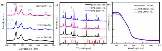 (a) Raman, (b) X-ray diffraction (XRD) patterns, and (c) absorption spectra of pristine Ti-Fe2O3, OPT-100W-150s, and OPT-200W-70s photoanodes, respectively.