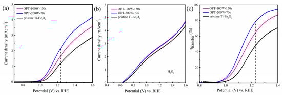 (a) The J-V curves of optimum OPT-Ti-Fe2O3 and pristine Ti-Fe2O3 photoanodes measured in the electrolyte of 1 M NaOH aqueous solution. (b) Linear sweep voltammetry (LSV) scans of OPT-100W-150s, OPT-200W-70s, and pristine Ti-Fe2O3 photoanodes under irradiation in 1 M NaOH aqueous solution with 0.5 M H2O2 from 0.4 V to 1.6 V vs. reversible hydrogen electrode (RHE) with a scan rate of 10 mV s−1. (c) Charge transfer efficiency of OPT-100W-150s, OPT-200W-70s, and pristine Ti-Fe2O3.