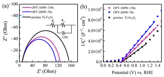 (a) Nyquist plots and (b) Mott-Schottky curves of pristine Ti-Fe2O3, OPT-100W-150s, and OPT-200W-70s electrodes. The inset is the equivalent circuit.