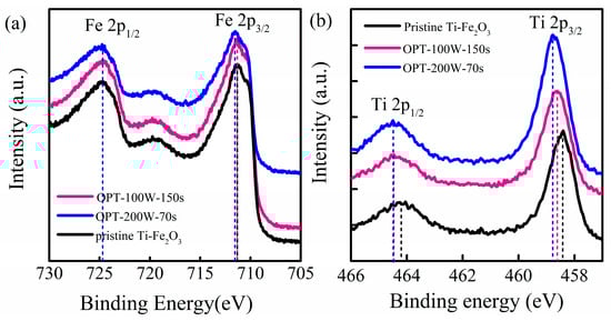 X-ray photoelectron spectroscopy analysis: (a) Fe 2p peaks and (b) Ti 2p peaks of OPT-100W-150s, OPT-200W-70s, and pristine Ti-Fe2O3 samples, respectively.