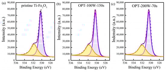 X-ray photoelectron spectroscopy of O 1s peaks of (a) pristine Ti-Fe2O3, (b) OPT-100W-150s, and (c) OPT-200W-70s samples.