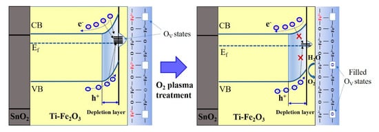 Finally, let us discuss the effect of O2 plasma treatment on the enhanced PEC performance of Ti-Fe2O3 photoanodes. The Fe2O3 nanowire photoanode has a large number of oxygen vacancies on the surface, which will generate extra electrons to reduce Fe3+ to Fe2+ []. When the concentration of oxygen vacancy is too high, Fe2+ sites may cause the recombination of photogenerated holes [], which decreases surface charge transfer properties, and therefore retards the kinetics of hole reaction [,]. Furthermore, the oxygen vacancy is difficult to remove as an intrinsic defect. However, O2 plasma has high reactivity to fill up the oxygen vacancies at the photoanode surface. Thus, the ratio of Ov/O2- is reduced when highly reactive oxygen atoms collide with the photoanodes’ surface, which in turn causes the reduction in donor density of the Ti-Fe2O3 photoanode. The filling of the oxygen vacancy also reduced the amount of Fe2+ sites, which was consistent with the decreased intensity of Fe(II)-O peaks in XPS spectra. Therefore, the surface recombination mediated by oxygen vacancies was lowered, and the charge transfer properties were enhanced, leading to a remarkably improved PEC performance, as illustrated in Scheme 1.