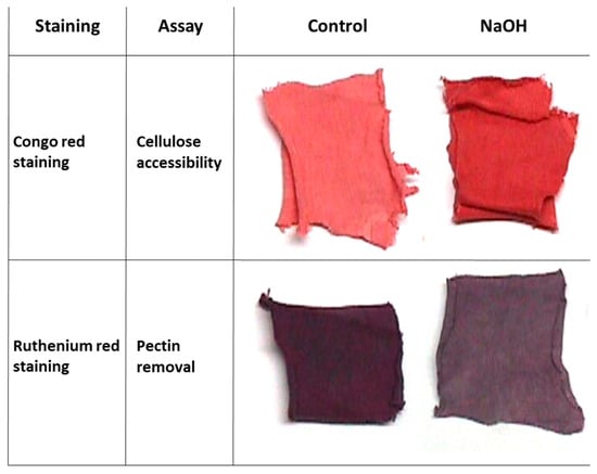 Conventional scouring of cotton fabrics is done with boiling alkaline caustic soda to remove the fibers’ outer layer of non-cellulosic substances. To demonstrate this chemical process outcome on pectin removal and cellulose accessibility, NaOH-treated and untreated (control) cotton fabrics square pieces of 1 g were stained with Congo red (staining of the cellulose layer) and Ruthenium red (staining of the pectin layer). Differences between the sodium hydroxide-treated swatches and the control treatments can be easily observed visually (Figure 1).