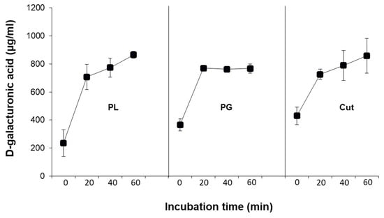 Tracking the concentration changes over time of D-galacturonic in the reaction mixture of natural cotton fabrics and cutinase (Cut), pectin lyase (PL), or polygalacturonase (PG). Initial enzyme activity was as follows: 0.7 U/mL of Cut, 1.0 U/mL of PL and 0.5 U/mL of PG. The enzymatic treatment was carried out by incubating one dry and weighed swatch of fabric in the reaction solution at a 1 gr cloth/10 mL ratio in 15 mL polycarbonate test tubes. The reaction mixture contained a non-ionic detergent (AvcoPal-AWS) 0.1% (w/v), a 100 mM phosphate buffer, pH 8 for cutinase and PL and 50 mM acetate buffer, pH 5 for PG and the corresponding enzyme. Incubation was performed by placing the test tubes diagonally in a rotary shaker and rotating them at 175 rpm and 37 °C for the indicated times. Values represent an average of three independent replicates. Bars indicate standard deviation.