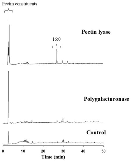 Reverse-phase HPLC-ELSD detected the major constituents released from the cotton fabric as a result of the pectin-degrading enzymes attack. Elution was executed using a gradient system consisting of acetonitrile:tetrahydrofuran:trifluoroacetic acid (0.1% in water). The extent of pectin degradation was increased four-fold as the result of pectin lyase or polygalacturonase compared to the control. This activity was expressed mainly by the release of pectin constituents, observed by a major peak at 2.8–2.9 min (Figure 5). Interestingly, the pectin lyase attack on the cotton fabrics’ outer layer also resulted in the release of some of the waxy layer components, observed by a significant C:16 peak at ca 28 min. This outcome was not observed in the polygalacturonase reaction fluid.