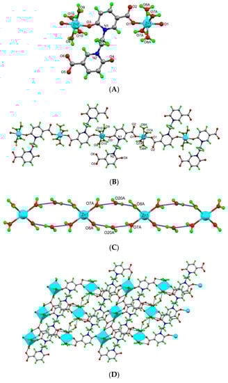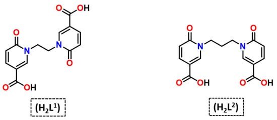 Coordination polymers (CPs) have attracted an enormous interest over the years not only because of their intriguing architectures and topologies, but also for their diversified applications in various areas such as gas adsorption and separation, molecular magnetism, luminescence, sensing, etc. [1,2,3,4,5,6,7]. Apart from these, CPs, as heterogeneous catalysts have also marked their foothold due to their recyclability and easy workup [8,9,10,11,12,13]. Numerous factors such as the choice of organic ligands, metal ions, solvent, metal to ligand ratio, pH, temperature, etc. play a crucial role in the self-assembly processes of CPs [14,15]. In the design of CPs, the rigid ligands have mostly been accounted for as a well-known way to generate multidimensional structures [16,17,18,19,20]. On the other hand, it is hard to develop CPs with flexible ligands due to their flexible nature, which can adopt different orientations during the self-assembly process [21,22,23,24]. Nevertheless, the conformational opportunity of the flexibly adaptable ligands offers a greater possibility for the development of multidimensional structures with uncommon topological and microporous CPs [25,26,27,28]. Among the different organic linkers, flexible multicarboxylate (in particular dicarboxylate) ligands have been regularly employed as multifunctional linkers in light of their plentiful coordination modes to a metal ion for the generation of polymeric frameworks. For example, dicarboxylic acids such as succinic acid, glutaric acid, adipic acid, etc. are the sorts of carboxylic acids that have been chosen to construct multidimensional structures because of the presence of a flexible C–C bond [29,30]. Dicarboxylate ligands with a flexible C–C bond can be viewed as a convenient linker for the construction of multidimensional CPs. Keeping these concepts in mind, two new pro-ligands (Figure 1) have been designed having both a dicarboxylate linker and a flexible C–C arm for the construction of CPs.