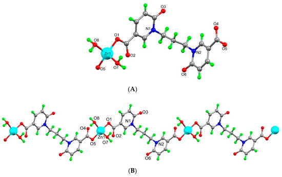According to the single X-ray diffraction analysis, both CPs [Zn(L)(H2O)4]n.nH2O (1) and [Zn(L)(H2O)2]n (2) had one-dimensional structures. The CP 1 had a 1D network with an asymmetric unit made of two Zn2+ ions (each of them with an 0.5 occupancy), one (L1)2− ligand, four water ligands (two per metal cation), and one non-coordinated water molecule (Figure 2A). Symmetry expansion revealed that both the Zn(II) centers had octahedral coordination geometry. The Zn1 center was coordinated by two carboxylate-O from two (L1)2− ligands [Zn1-O1 1.961(5) Å] and four water molecules [Zn1-O7A 2.074(13) and Zn1-O8A 2.143(14)], whereas the coordination environment of the Zn2 center was fulfilled by two keto-O atoms from two neighboring (L1)2− ligands [Zn2-O3 2.073(8) Å] and four water molecules [Zn2-O9 2.153(8) and Zn2-O10 2.063(8)] (Figure 2B). The Zn-Owater bond distances were in the range of 2.063 Å to 2.163(17) Å. Since in 1, the Zn1 and Zn2 centers are attached to the same pyridine ring, they alternate their positions to create the 1D linear chain-like structure (Figure 2C). The carboxylate and keto groups from the remaining pyridine ring are uncoordinated and only participate in H-bonding interactions. In CP 1, the organic ligand adopts a stair type orientation with the pyridine rings residing in two different and almost parallel planes (bit angle of 3.24°) and the N1-C7-C8-N2 torsion angle of 169.73°. The plane of the carboxylate group is approximately in the pyridine plane (bite angle of 7.93°). The Zn···Zn distance is 10.158 Å.
