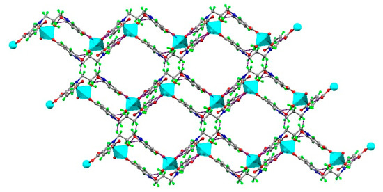 Methyl 6-hydroxynicotinate, 1,2-dibromoethane, 1,3-dibromopropane, K2CO3, and Zn(NO)3.6H2O (98.0% purity) were obtained from Sigma Aldrich Chemical Co (Lisboa, Portugal). A Bruker Vertex 70 (Bruker Corporation, Ettlingen, Germany) instrument was used for recording the FTIR spectra in KBr pellets. Bruker Avance II + 300 (UltraShieldTM Magnet, Rheinstetten, Germany) spectrometers were used for recording the 1H (300 MHz) and 13C (75.45 MHz) NMR, respectively. Elemental analyses (C, H, and N) were performed by the microanalytical service provided by the Instituto Superior Técnico (Lisboa, Portugal). A Bruker APEX-II PHOTON 100 diffractometer was used for collecting the X-ray data with graphite monochromated Mo-Kα (λ = 0.71069) radiation. A D8 Advance Bruker AXS (Bragg Brentano geometry, Bruker, Madison, WI, USA) diffractometer was used for collecting the PXRD data. TGA was carried out under nitrogen atmosphere at a heating rate of 10 °C min−1 on a Perkin-Elmer Instrument system (STA6000, Perkin-Elmer, Boston, MA, USA).