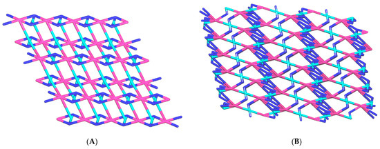 We performed the topological analysis of the hydrogen-bonded networks of 1 and 2 by reducing its multidimensional structure to simple node-and-linker net1 using software TOPOS 4.0.17 [47,48,49]. The topological analysis of the H-bonded structure of compound 1 revealed that it has a 3,4,6-connected trinodal net and point symbol {4.64.8}{42.68.85}{43}2, whereas the hydrogen-bonded network of compound 2 exhibits a more complex 2,3,3,4,6,7-connected hexanodal net with point symbol {3.42}2{3.43.52.67.73.85}2{32.42.52.64.74.9}{42.6}2{64.8.10}{6}2 (Figure 5A,B).