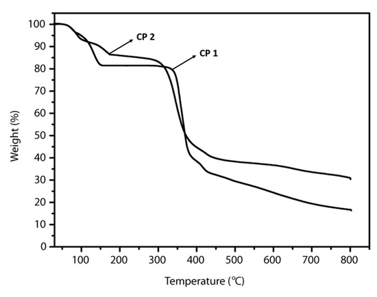 Thermogravimetric analyses (TGA) of the CPs 1 and 2 were examined to see their thermal stabilities in the temperature range of 30–800 °C with a heating rate of 10 °C min−1 under a dinitrogen atmosphere. As depicted in Figure 6, CP 1 exhibited a weight loss of 3.85% in the temperature range of ca. 80–100 °C, resulting from the loss of one lattice water molecule (calculated = 3.93%). A further step with a weight loss of ca. 15.2% (calculated = 15.73%) was detected in the temperature range of ca. 100–140 °C, accountable for the loss of the four coordinated water molecules. At ca. 140–330 °C it was stable, but over 330 °C, the polymeric framework deteriorated, prompting the generation of ZnO. On the other hand, CP 2 displayed a sharp decay in its TGA curve (Figure 6) in the range of ca. 65–105 °C in conjunction with the weight loss of ca. 8.1% (calcd. 7.93%), responsible for the loss of two lattice water molecules. An immediate second step with a weight loss of ca. 7.8% (calcd. 7.93%) was detected in the temperature range of 105–175 °C due to the loss of the two coordinated water molecules. It was then found to be thermally stable up to 300 °C, beyond which it breaks down to produce ZnO.