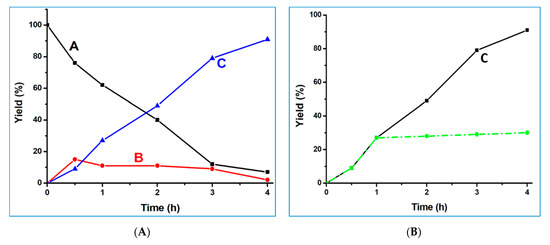 (A) Plot of yield (or relative amount in case of A) vs. time (h) for the cascade deacetalization-Knoevenagel reactions catalyzed by CP 1 [blue line: 2-benzylidenemalononitrile (C); red line: benzaldehyde (B); black line: unreacted benzaldehyde dimethyl acetal (A)]. (B) Plot of yield of C vs. time (h) for the cascade deacetalization-Knoevenagel reactions catalyzed by CP 1 [black line: yield of C); dotted green line: yield of this product upon removal of the catalyst after 1 h of reaction].
