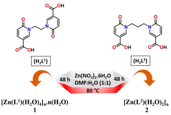 The pro-ligands 1,1′-(ethane-1,2-diyl)bis(6-oxo-1,6-dihydropyridine-3-carboxylic acid) (H2L1) and 1,1′-(propane-1,3-diyl)bis(6-oxo-1,6-dihydropyridine-3-carboxylic acid) (H2L2) were synthesized by treating methyl 6-hydroxyisonicotinate with 1,2-dibromoethane (for H2L1) and 1,3-dibromopropane (for H2L2) in the presence of K2CO3 in acetone under stirring at room temperature followed by hydrolysis, as presented in Scheme S1, ESI. The coordination polymers 1 and 2 were prepared by the hydrothermal reaction of H2L1 and H2L2 with Zn(NO3)2.6H2O, respectively, in a solvent mixture of DMF:H2O at 80 °C for 48 h as depicted in Scheme 1.