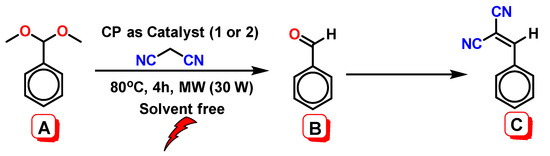 Under typical conditions, a combination of the initial reagent benzaldehyde dimethyl acetal (A, 0.152 g, 1.0 mmoL), with the methylene activated one (i.e., malononitrile (0.132 g, 2.0 mmoL) and the zinc CP catalyst (15.2 mg or 27.0 mg for 1 or 2, respectively; 3.0 mol%)) was placed in a glass vessel covered with a Teflon cap and stirred at 80 °C under microwave irradiation (30 W) for 4 h in solvent-free conditions. The desired product was identified by 1H NMR spectroscopy (Figures S1 and S8).