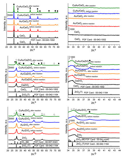 XRD patterns were carried out to obtain information about the crystallinity of oxides, the coordination of selected oxides and the size of metallic gold particles. XRD patterns performed for materials confirmed that all oxides were characterized by crystal phase (Figure 1). Ceria was characterized by the crystal cubic phase. In the case of catalysts with pure zirconia as the support, XRD patterns were characterized of two phases: the tetragonal and monoclinic phase. The XRD patterns of CeZrOx confirmed the domination of reflections due to the crystal structure of zirconia. It can suggest that, in mixed cerium-zirconium oxide, ceria crystals were located in the structure of zirconia particles. The XRD patterns recorded for bimetallic catalysts showed that the addition of copper species leads to the creation of the crystal phase of metallic gold particles, which has a size bigger than 5 nm (the reflections at 2θ = ~38.2°).