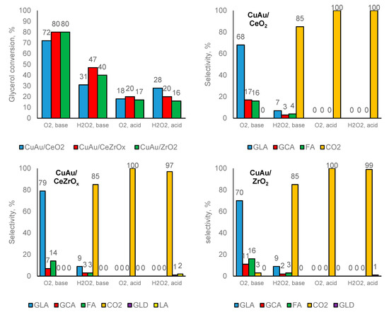 Conversions and selectivities achieved over selected bimetallic copper-gold catalysts in glycerol oxidation in the presence of pure oxygen (6 bars = 5.4 mmol) or hydrogen peroxide (6.6 mmol) and acid (HNO3) or base (NaOH) in the reaction solution. Reaction conditions: 15.00 g of H2O; molar ratio NaOH:glycerol = 2:1 (3.0 mmol of NaOH; 1.5 mmol of glycerol) or HNO3:glycerol = 2:1 (3.0 mmol of HNO3; 1.5 mmol of glycerol), 30.0 mg catalyst (1.52 × 10−6 mol Au and 8.03 × 10−6 mol Cu in CuAu/CeO2 and CuAu/CeZrOx; 9.14 × 10−7 mol Au and 8.03 × 10−6 mol Cu in CuAu/ZrO2); reaction temperature: 333 K, time: 5 h, stirring speed: 1000 rpm. GLA means glyceric acid, GCA—glycolic acid, FA—formic acid, TA—tartronic acid, GLD—glyceraldehyde, and LA—lactic acid.