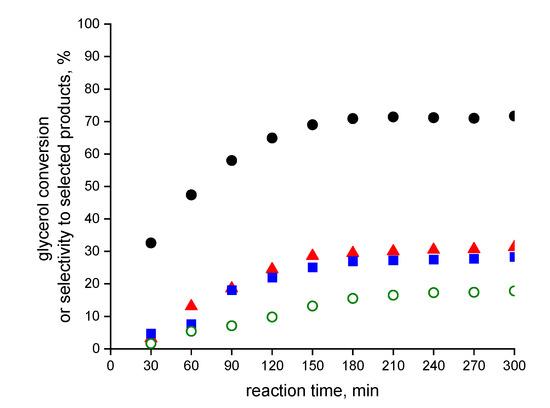 The catalysts modified with copper species in the form of CuO supported on selected oxides such as SiO2, Al2O3, CaO, SrO or ZrO2 were studied for the synthesis of lactic acid from glycerol in the liquid phase without using reducing or oxidizing agents [23,24,25]. The studied catalysts achieved high glycerol conversion and the selectivity to lactic acid—the highest selectivity to this acid was obtained over CuO/ZrO2 catalyst (94.6% yield). It is worth noting that lactic acid and its derivatives are used in the synthesis of biodegradable fibers and other biobased chemicals [23,26].