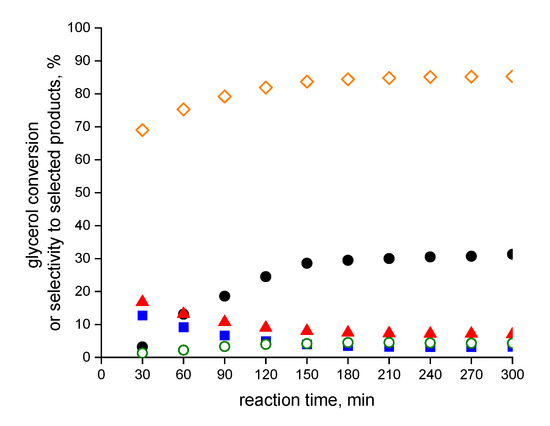 It was described in Reference [12] that the composition of reaction mixture can influence the catalytic properties of catalysts. It was shown that the reaction selectivity over gold catalysts can be controlled by the particle size of noble metal [19] and the properties of the support [20]. It was shown in Reference [21] that the size of gold nanoparticles and their content can lead to high activity in glycerol oxidation. The authors of this research explained this phenomenon that low Au loadings favor the formation of smaller homogenous gold nanoparticles, because these particles are stronger adsorption sites for glycerol molecules. It was also reported that other catalysts, based on noble metals, can be effective for the oxidation of glycerol to glycolic acid in the liquid phase, e.g., about 85% glycerol conversion and 57% selectivity to glycolic acid were obtained over the Ag/Al2O3 catalyst [22].
