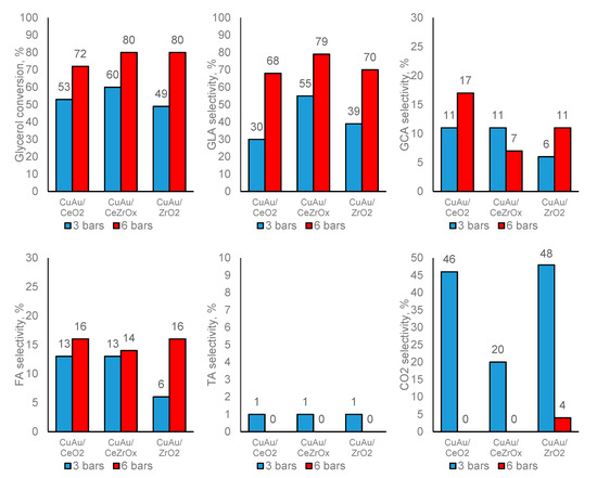The influence of different oxygen pressures on the catalytic activity over copper-gold catalysts was also studied in glycerol oxidation at 333 K for 5 h in alkali media. The results, collected in Figure 5, show that the decreasing of oxygen concentration used to glycerol oxidation from 6 to 3 bars leads to the decrease of conversion. At lower oxygen pressure (3 bars), the selectivity to glyceric acid for all copper-gold catalysts and glycolic acid, excluding CuAu/CeZrOx, decreases and the selectivity to carbon dioxide increases. At lower oxygen contents, cerium-zirconium oxide positively effects glycerol conversion and it can suggest the presence of the interaction between cerium and zirconium species, which improves the catalytic properties of the active phase (the bimetallic Cu-Au system) in the oxidation process. The increase of oxygen content in the autoclave improves not only glycerol conversion in its oxidation, but also the selectivity to glyceric acid, especially over catalysts with cerium species. It suggests that cerium species lead to the increase in the adsorption rate on the surface of catalysts of oxygen molecules and their migration to metallic gold particles. This phenomenon confirms the results presented earlier in References [57,58].