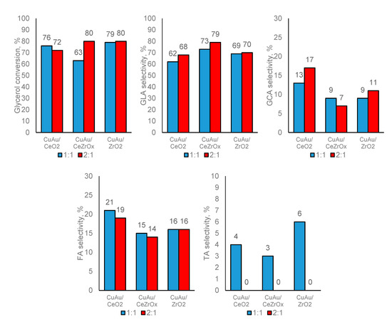 It was reported in References [57,58] that high conversion during the oxidation in the gas phase of different chemical compounds (e.g., methanol or carbon dioxide) can be achieved over the bimetallic copper-gold catalysts. The novelty in this work is the presentation of the influence of selected factors (e.g., oxygen source and its pressure, pH solution, etc.) on the conversion of glycerol in its oxidation in the liquid phase and the selectivity of products over catalysts based on ceria, zirconia, cerium-zirconium oxides modified with gold and copper species.