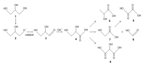 The products of glycerol oxidation, where (1) glycerol, (2) glycerolate, (3) glyceraldehyde, (4) glyceric acid, (5) lactic acid, (6) oxalic acid, (7) glycolic acid, (8) formic acid, and (9) tartronic acid.