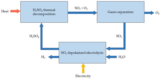 Following this step, SO2 is separated from O2 and introduced in an electrochemical cell. SO2 is then oxidized into sulfuric acid, protons, and electrons at the anode (Equation (3)). The protons are recombined with electrons on the cathode to form hydrogen (Equation (4)). The overall cell voltage is more than 7 times lower than that needed in the conventional electrochemical splitting of water. Therefore, this process requires a lower voltage (0.158 V vs. SHE) than the direct electrolysis of water (1.23 vs. SHE) for hydrogen production [9]. This electrochemical cell can be operated with photovoltaic panels as the typical water electrolysis. Therefore, similar to other thermochemical processes, hydrogen and oxygen are the only outputs, and the acid by-products are not expelled. Moreover, the hybrid cycle has the following advantages: (a) It requires lower temperatures; and (b) can be driven by the concentrated and photovoltaic solar power energy. Energy efficiencies of around 50% have been reported [8].