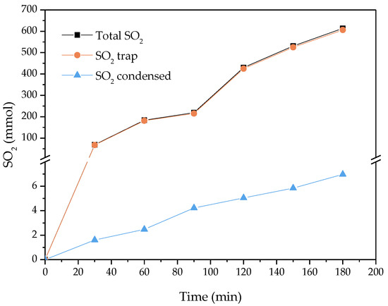 Figure 2 shows the time course of the total SO2 production, during a test carried out at 1173 K with 1 g of CuO as the catalyst and WHSV of 50 g H2SO4/gcat/h (calculated as the amount of the evaporated sulfuric acid divided by the catalyst amount and the time of reaction). As can be seen, the catalytic reactor can efficiently generate SO2. It is worth highlighting that the total SO2 was measured as the sum of the SO2 retained in the NaOH trap as Na2SO3. Additionally, the SO2 condensed along with the water and H2SO4. Moreover, most of the SO2 formed passed in a gaseous form through the condenser and, finally, it was bubbled into the NaOH solution. Therefore, only an amount of 7 mmol of SO2 was condensed with the acidic solution, corresponding to 1.14% of the total SO2 formed.