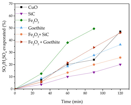 Figure 5 shows the efficiency of the different catalysts studied in mmol of SO2 produced per gram of H2SO4 evaporated and per gram of catalyst. Since the mmol of SO2 were measured by the titration methods explained in the Experimental Methods section, the gram of sulfuric acid calculated by the difference between the initial and final weight and the gram of catalyst is the amount of weight introduced in the reactor. The lowest efficiencies obtained corresponded to the experiments using SiC, confirming its low activity in the SO2 formation. Fe2O3, Fe2O3 + goethite, CuO, and goethite obtained efficiency values 2.6, 2.4, 2.2, and 2.0 times higher than that obtained for the SiC, respectively. From these results, it is evident that the metal oxides presented a very high activity in the sulfuric acid decomposition, with Fe2O3 being the most active of the studied catalysts. Furthermore, this oxide and goethite mixture is very promising.