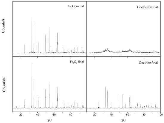 The characterization of initial and final catalysts of the Fe2O3 as well as the goethite experiments were evaluated to determine the differences shown in their activities. Considering the Pourbaix diagram of iron, Fe2+ is the main species at acidic pH and 298 K in the water system. For that reason, the catalyst could suffer iron leaching during the process [26]. Therefore, the catalysts were characterized by the XRD analysis to determine the iron species, as shown in Figure 6. In the case of Fe2O3, the catalysts presented the same peaks before and after the reaction. These results indicate that the catalyst had the same crystalline phase at the end of the reaction, specifically, that of hematite form. Regarding the goethite, the initial sample presented a relatively amorphous form. However, after 2 h of reaction, the goethite was transformed due to the reaction conditions (mainly, the high temperature and its possible reaction with steam). After the reaction, goethite presented a similar crystallinity to the Fe2O3 sample (hematite).