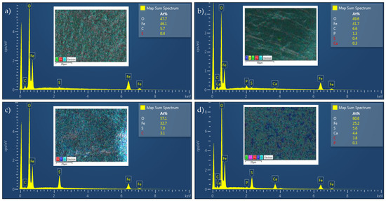 As can be seen, Figure 8 shows the EDX analysis and Table 1 presents the atomic percentage of O, Fe, and S of the initial and final catalysts. In both cases, the catalysts increased their content of sulfur and oxygen after the reaction. This fact can be related to the adsorption or the deposition of sulfuric acid, as well as the intermediates formed in the reaction. Regarding the inserted images, the sulfur appeared as distributed in the whole surface (blue color).