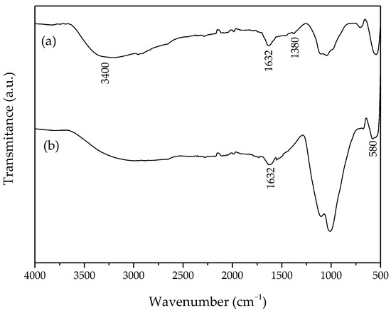 Finally, the Fourier transform infrared spectroscopy was carried out to monitor the chemical and structural changes in the goethite catalyst. A comparison of the FTIR spectra of the initial and final goethite samples is shown in Figure 9. As can be seen, the initial goethite presents vibration bands of the hydroxyl groups and/or water molecules at around 3400 and 1632 cm−1 [27]. These bands appear with a lower intensity in the final sample, indicating that the chemical surface of the goethite changed after the reaction, removing the water and hydroxyl groups. Moreover, in the initial sample, a very weak characteristic goethite band appears at 1380 cm−1 [27], which disappears in the sample after the reaction. Whereas, the final sample has a peak at 580 cm−1 associated with a Fe–O vibration band [22], which did not appear in the pristine sample. These results agree with those obtained in XRD, which indicated that the goethite surface was transformed into iron oxide.
