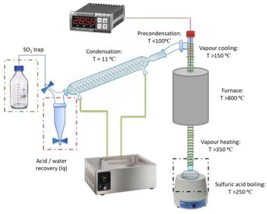 Figure 10 shows a scheme of the experimental setup used in the sulfuric acid decomposition. Sulfuric acid (100 mL) was introduced and boiled in a Florence Flask. The acid vapor was heated until 423–673 K and then led to a flow through the quartz reactor (length: 60 cm, diameter: 1 cm), in which a crushed catalyst bed was placed (bed diameter: 0.8 cm, 1–10 g). The catalytic reaction was carried out at 1123–1173 K inside a controlled furnace. The thermocouple was introduced in a quartz protection inside the quartz reactor. The flue gas was cooled and conducted to a condenser along with a liquid collector with tap, where the water and unreacted sulfuric acid were recovered. The gaseous products (SO2 and O2) were bubbled into a NaOH solution (6 M), where the SO2 reacted producing sodium sulfite (Na2SO3), and the O2 vented out.